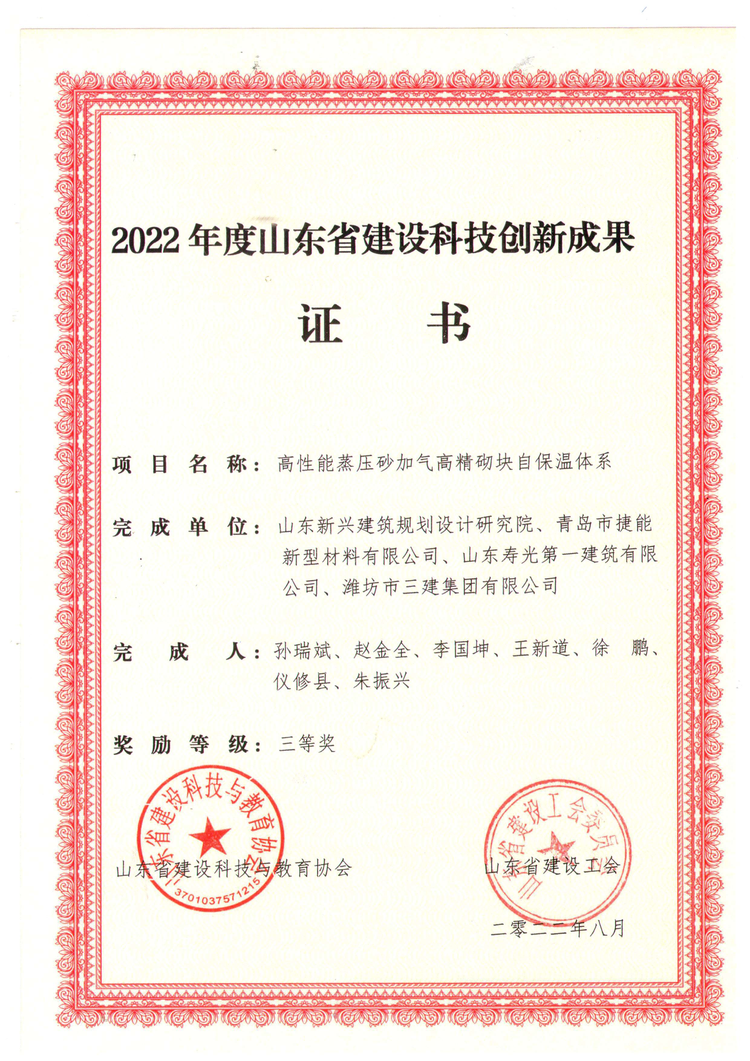 高性能蒸壓砂加氣高精砌塊自保溫體系科技成果三等獎